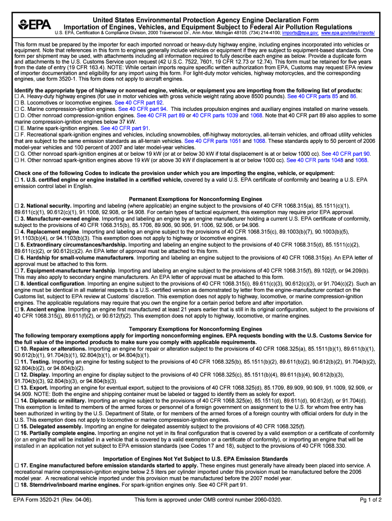 Importers of nonroad or heavy-duty highway engines must submit the US EPA Engine Declaration Form as part of compliance with federal air pollution regulations.