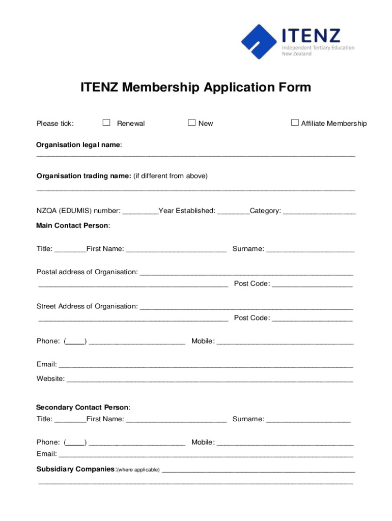 ITE NZ Membership Application Form Please tick:Renewal New Affiliate MembershipOrganisation legal name: Organization trading name: (if different from above) NZ QA (EDU MIS) number: Year Established: