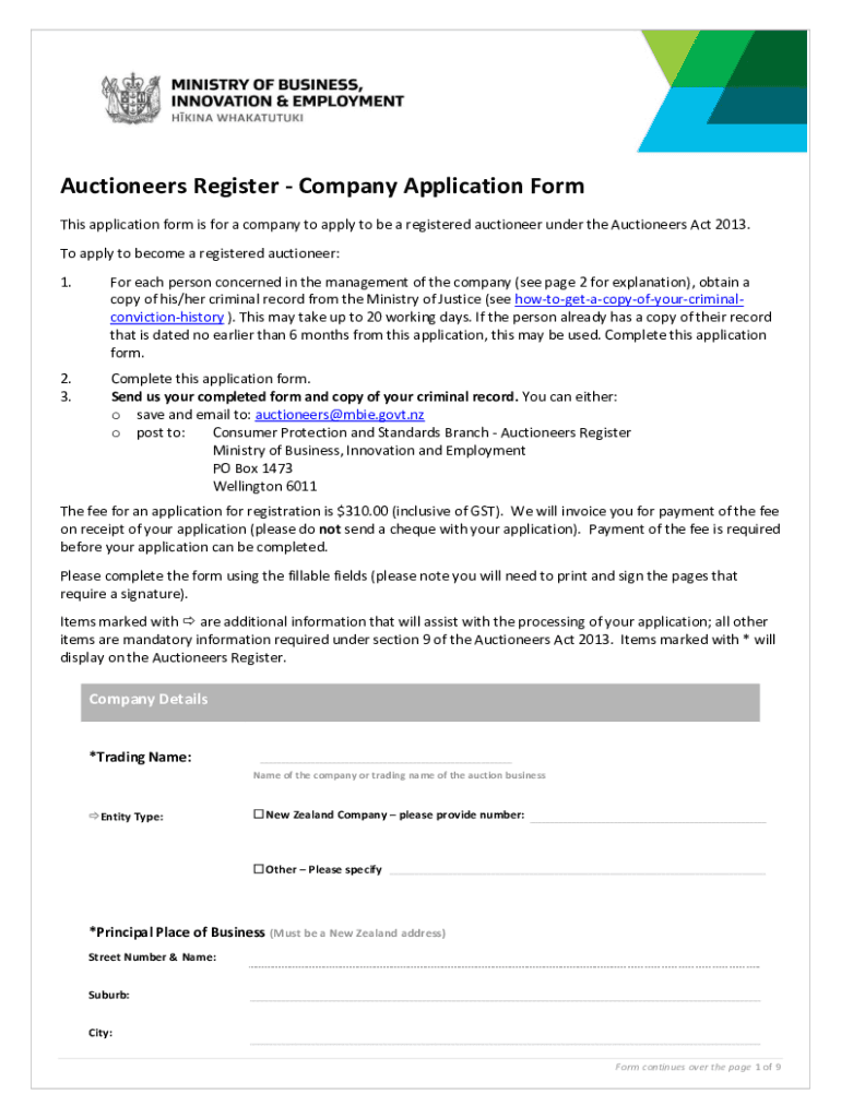 Auctioneers Register Company Application Form This application form is for a company to apply to be a registered auctioneer under the Auctioneers Act 2013. To apply to become a registered auctioneer: