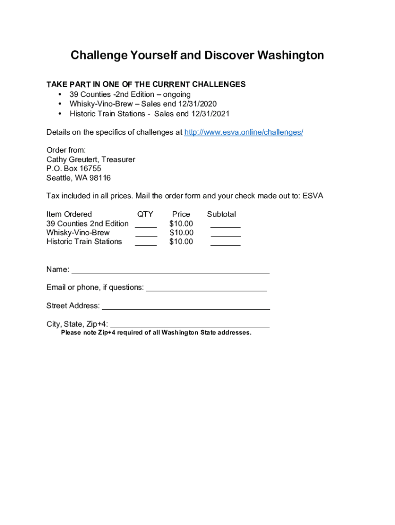 Challenge Yourself and Discover Washington TAKE PART IN ONE OF THE CURRENT CHALLENGES 39 Counties 2nd Edition ongoing WhiskyVinoBrew Sales end 12/31/2020 Historic Train Stations Sales end 12/31/2021