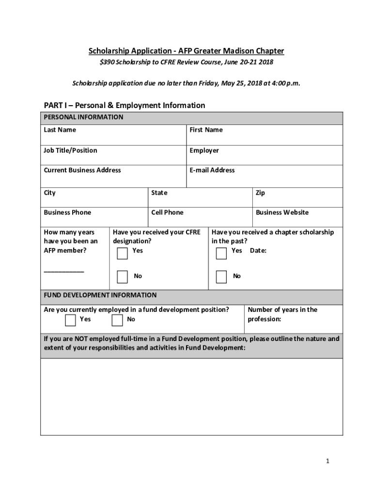 ScholarshipApplicationAFPGreaterMadisonChapter $390ScholarshiptoCFREReviewCourse,June20212018 ScholarshipapplicationduenolaterthanFriday,May25,2018at4:00p.m. PARTIPersonal&EmploymentInformation PERSONALINFORMATIONLastNameFirstNameJobTitle/PositionEmployerCurrentBusinessAddressEmailAddressCity