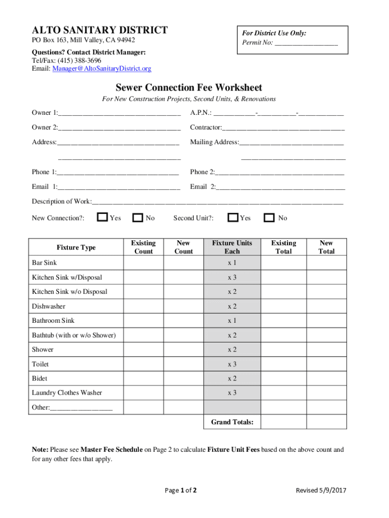 Get the free PDF ALTO SANITARY DISTRICT Sewer Connection Fee Worksheet