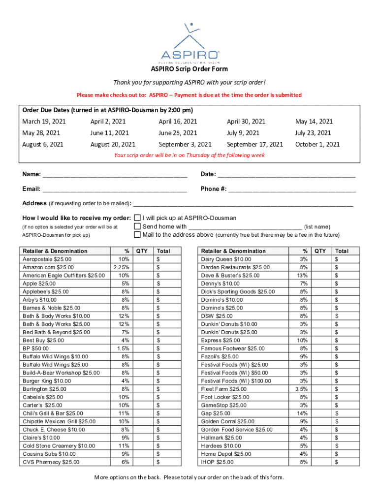 ASPIRE Scrip Order Form Thank you for supporting ASPIRE with your scrip order! Please make checks out to: ASPIRE Payment is due at the time the order is submittedOrder Due Dates (turned in at ASPIRODousman