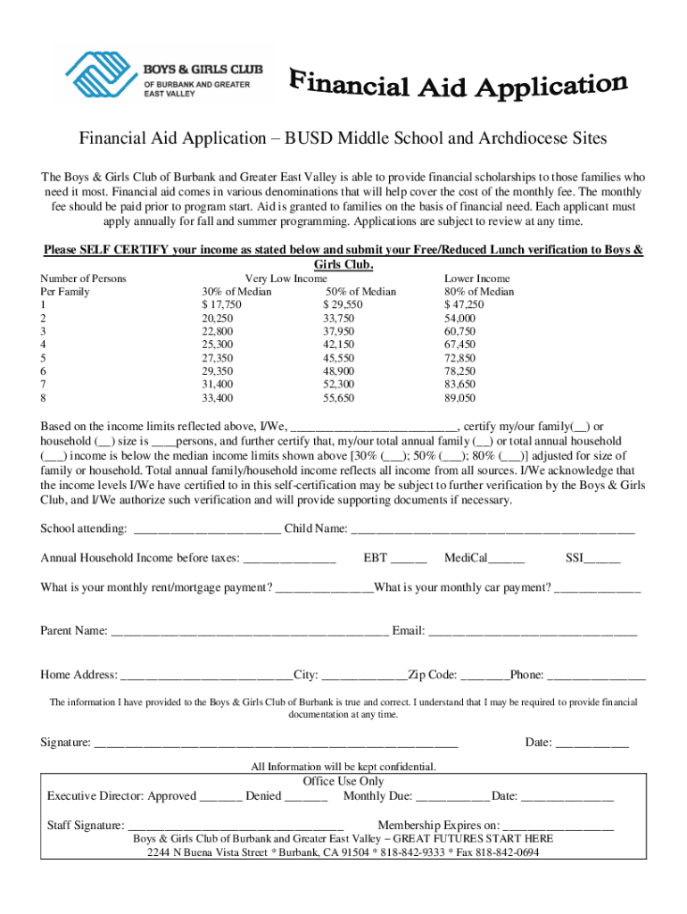 Financial Aid Application BUS Middle School and Archdiocese Sites The Boys & Girls Club of Burbank and Greater East Valley is able to provide financial scholarships to those families who need it most.
