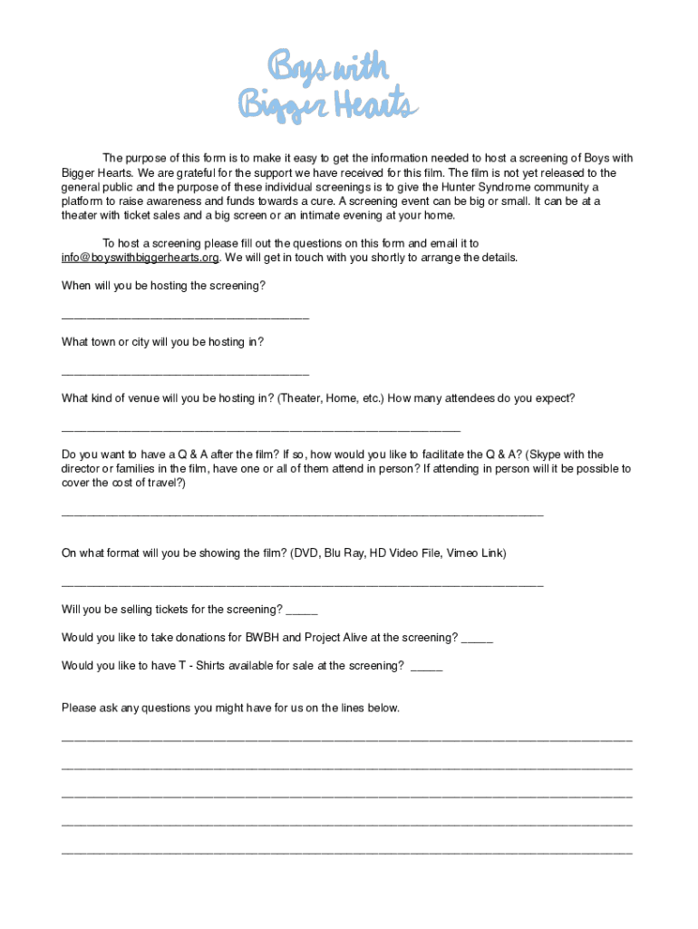 The purpose of this form is to make it easy to get the information needed to host a screening of Boys with