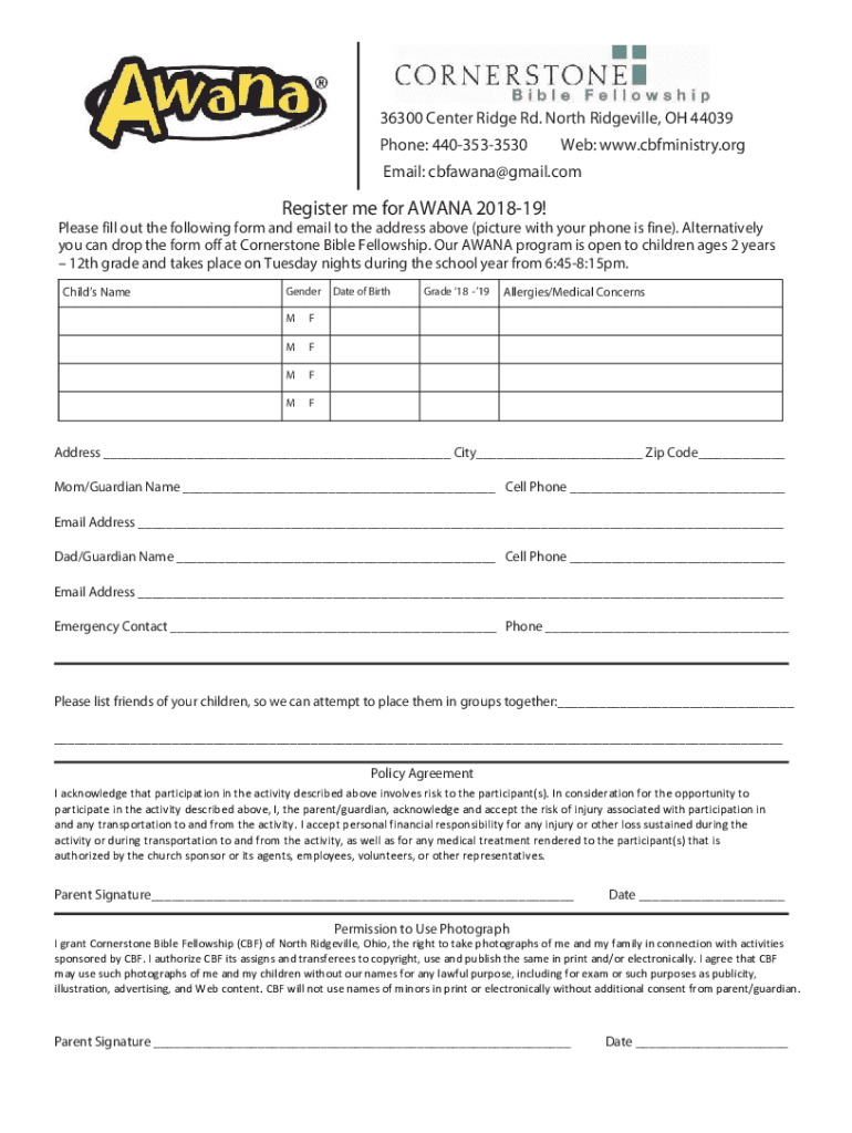 Start by downloading the AWANA 2017-18 registration form from the official website.