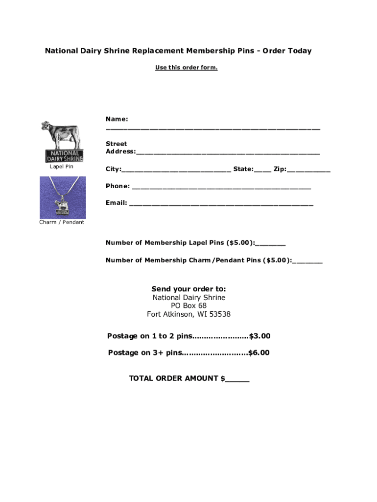 National Dairy Shrine Replacement Membership Pins Order Today Use this order form. Name: Street Address: Lapel Incite: State: Zip: Phone: Email: Charm / PendantNumber of Membership Lapel Pins ($5.00):