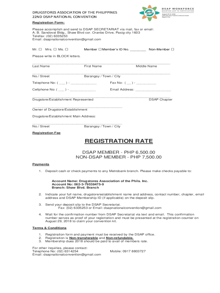 DRUGSTORES ASSOCIATION OF THE PHILIPPINES 22ND DSP NATIONAL CONVENTION Registration Form: Please accomplish and send to DSP SECRETARIAT via mail, fax or email: A. B. Sandoval Bldg., Shaw Blvd cor.