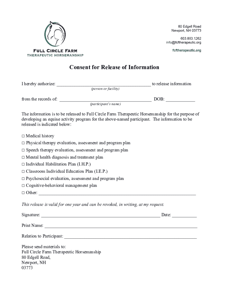 Consent for Release of Information I hereby authorize: to release information (person or facility)from the records of: DOB: (participants name)The information is to be released to Full Circle Farm
