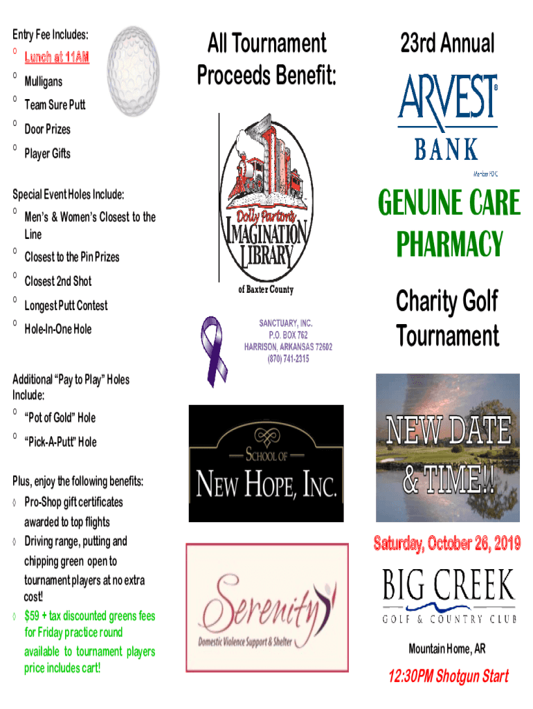 Entry Fee Includes: Lunch at 11AM Mulligans Tournament Proceeds Benefit:Team Sure Putt Door Prizes Player GiftsGENUINE CARE Pharmacopeial Event Holes Include: 23rd Annulment & Women's Closest to the