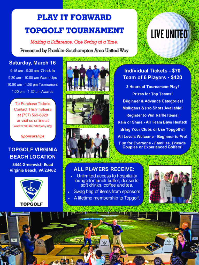 PLAY IT FORWARD TOOLS TOURNAMENT Making a Difference, One Swing at a Time. Presented by Franklin Southampton Area United Way Saturday, March 16 Individual Tickets $70 Team of 6 Players $4209:15 am