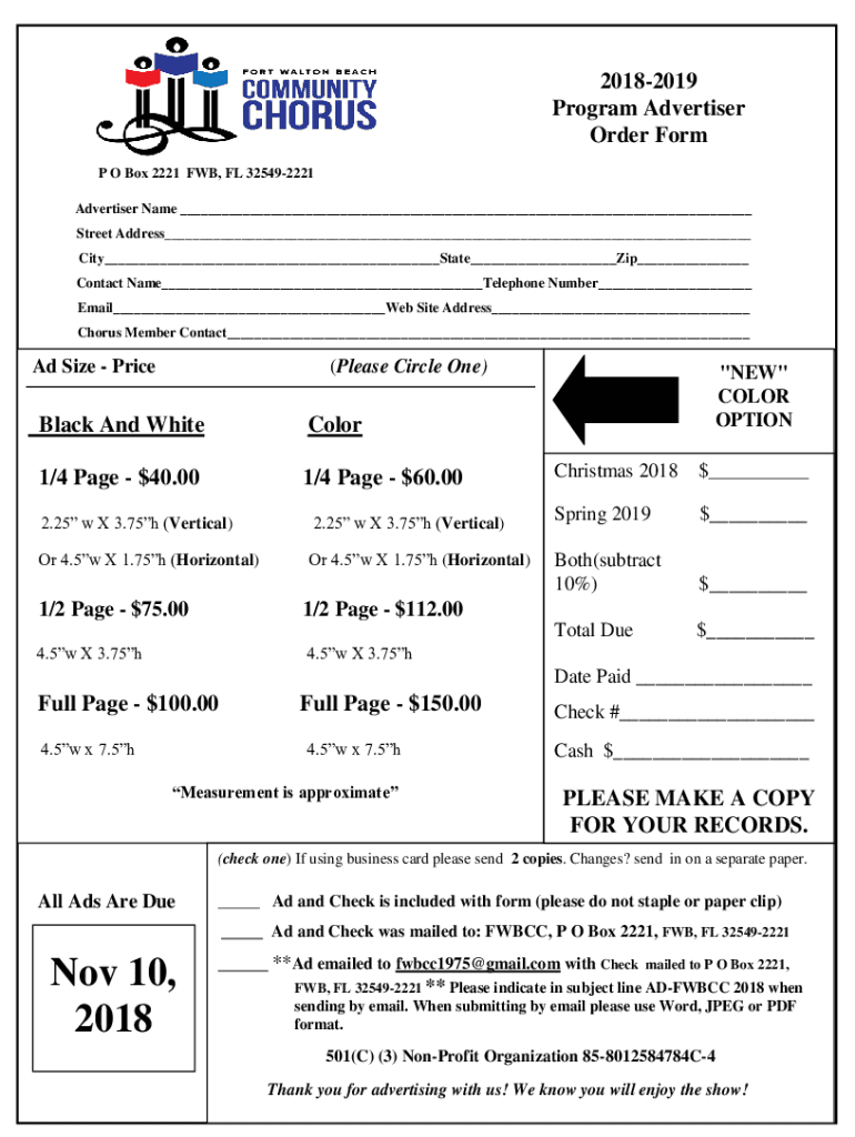 20182019 Program Advertiser Order Form P O Box 2221 FWB, FL 325492221 Advertiser Name Street Address City State Zip Contact Name Telephone Number Email Website Address Chorus Member Contact Ad Size