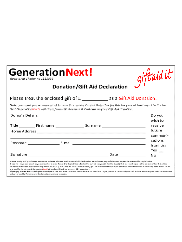 GenerationNext! Registered Charity no 1111399Donation/Gift Aid Declaration Please treat the enclosed gift of as a Gift Aid Donation. Note: you must pay an amount of Income Tax and/or Capital Gains
