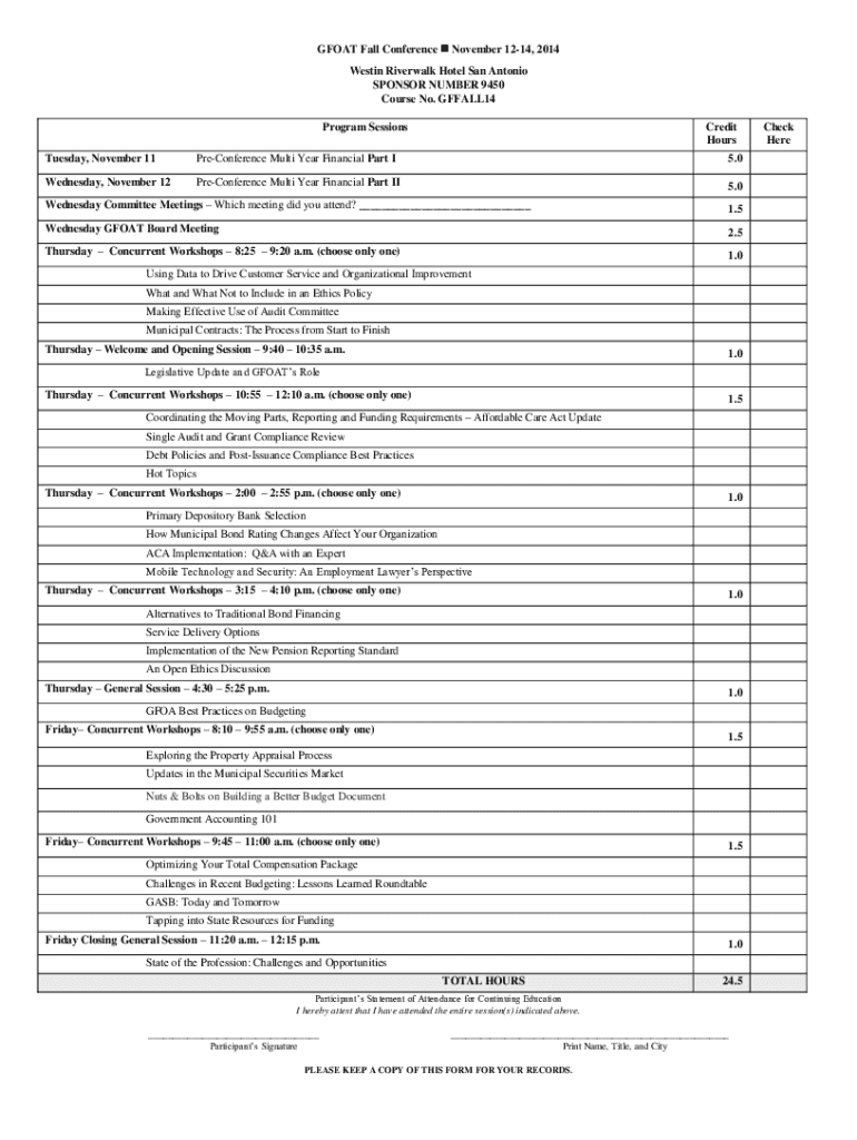 GOAT Fall Conference November 1214, 2014 Weston River walk Hotel San Antonio SPONSOR NUMBER 9450 Course No. GFFALL14 Program SessionsCredit Hours Tuesday, November 11PreConference Multi Year Financial