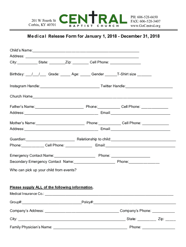 201 W Fourth St Corbin, KY 40701PH: 6065286650 FAX: 6065283407 www.GoCentral.orgM e d i c an l Release Form for January 1, 2018, December 31, 2018, Child's Name: Address: City: State: Zip: Cell Phone: