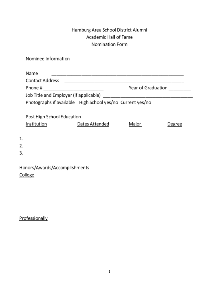 HamburgAreaSchoolDistrictAlumni AcademicHallofFame NominationForm NomineeInformation Name ContactAddress Phone# YearofGraduation JobTitleandEmployer(inapplicable) PhotographsifavailableHighSchoolyes/noCurrentyes/no