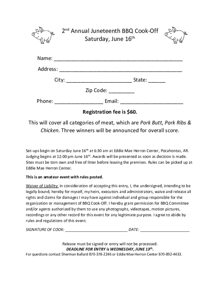 2nd Annual Juneteenth BBQ Cookout Saturday, June 16th Name: Address: City: State: Zip Code: Phone: Email: Registration fee is $60. This will cover all categories of meat, which are Pork Butt, Pork