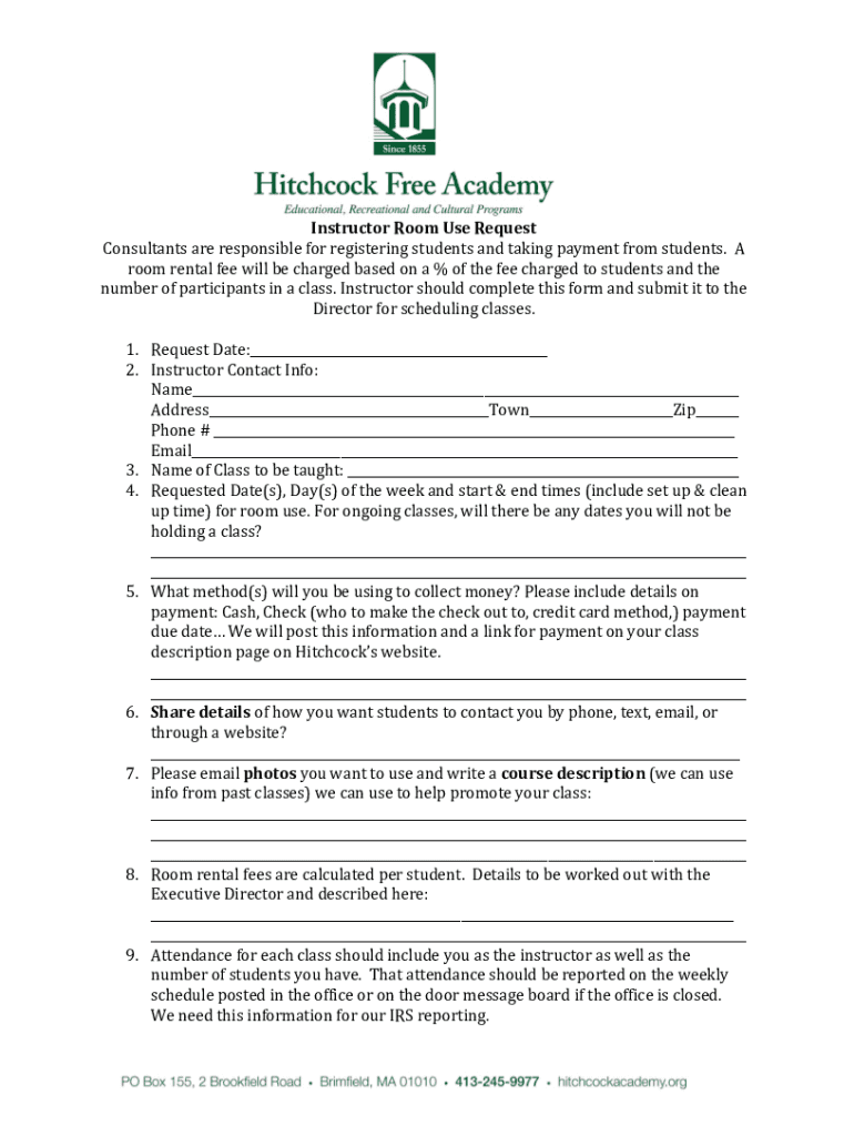 Instructor Room Use Request Consultants are responsible for registering students and taking payment from students. A room rental fee will be charged based on a % of the fee charged to students and