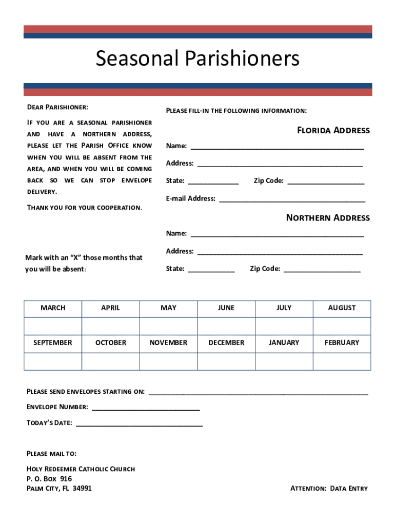 Seasonal Parishioners Dear Parishioner:Please fill the following information:If you are a seasonal parishioner and have a northern address, please let the Parish Office know when you will be absent