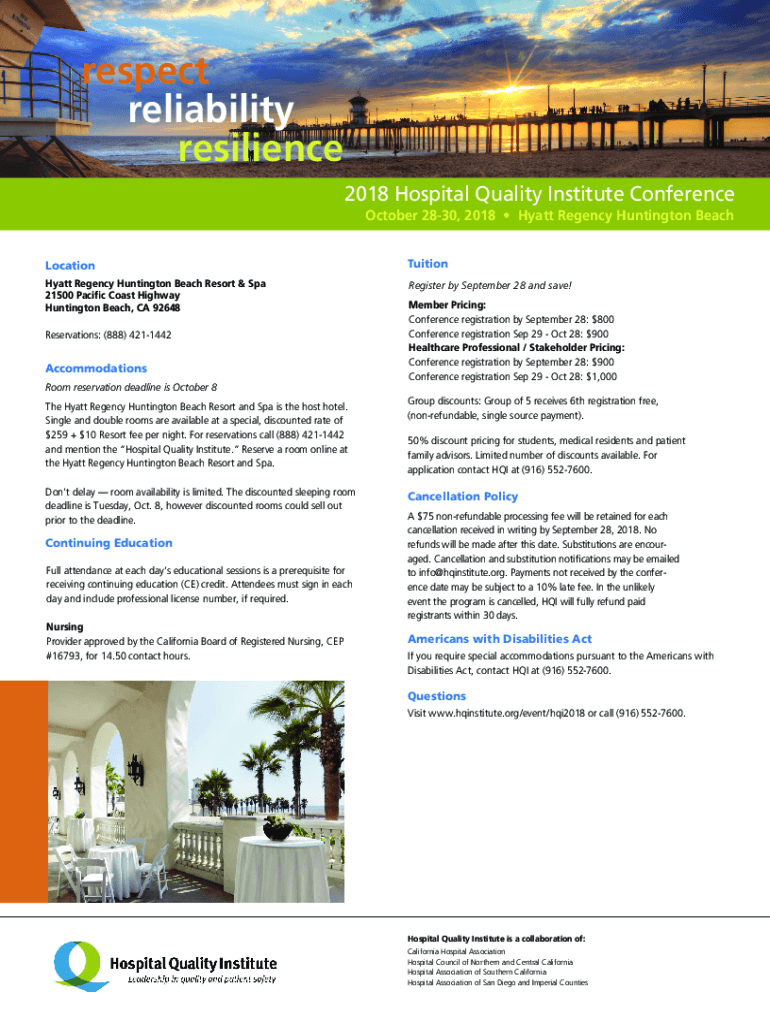 Respect reliability resilience 2018 Hospital Quality Institute Conference October 2830, 2018 Hyatt Regency Huntington Beach LocationTuitionHyatt Regency Huntington Beach Resort & Spa 21500 Pacific