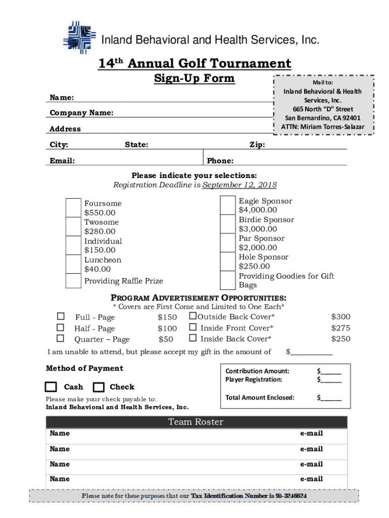 Inland Behavioral and Health Services, Inc.14th Annual Golf Tournament Sign-up Formal to:Inland Behavioral & Health Services, Inc. 665 North D Street San Bernardino, CA 92401 ATTN: Miriam TorresSalazarName: