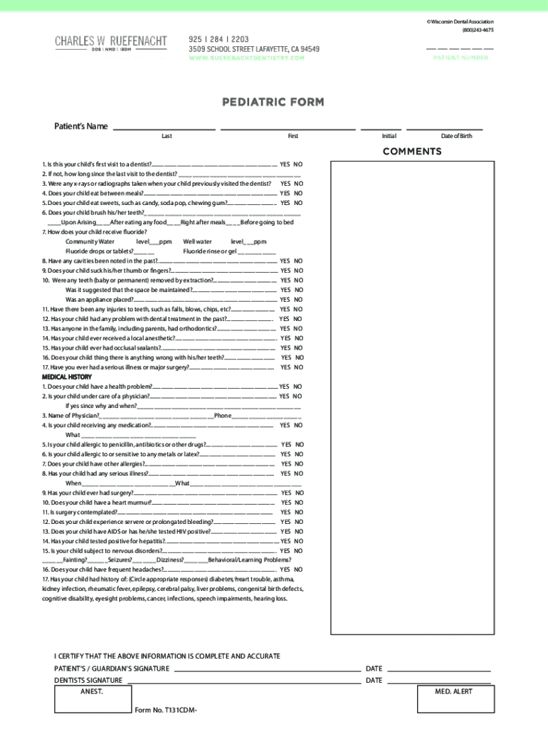 Wisconsin Dental Association (800)2434675PATIENT NUMBERPEDIATRIC FORM Patients Name LastFirstInitialDate of BirthCOMMENTS 1. Is this your children first visit to a dentist?.........................................................................................