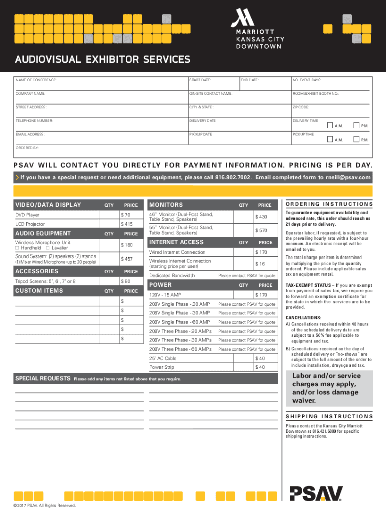 AUDIOVISUAL EXHIBITOR SERVICES NAME OF CONFERENCE:START DATE:END DATE:NO. EVENT DAYS:COMPANY NAME:ONSITE CONTACT NAME:ROOM / EXHIBIT BOOTH NO.:STREET ADDRESS:CITY & STATE :ZIP CODE:TELEPHONE NUMBER:DELIVERY