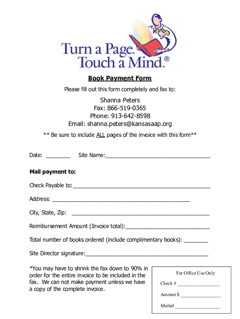 Book Payment Form Please fill out this form completely and fax to:Shanna Peters Fax: 8665190365 Phone: 9136428598 Email: Shanna. Peters Kansas.org ** Be sure to include ALL pages of the invoice with