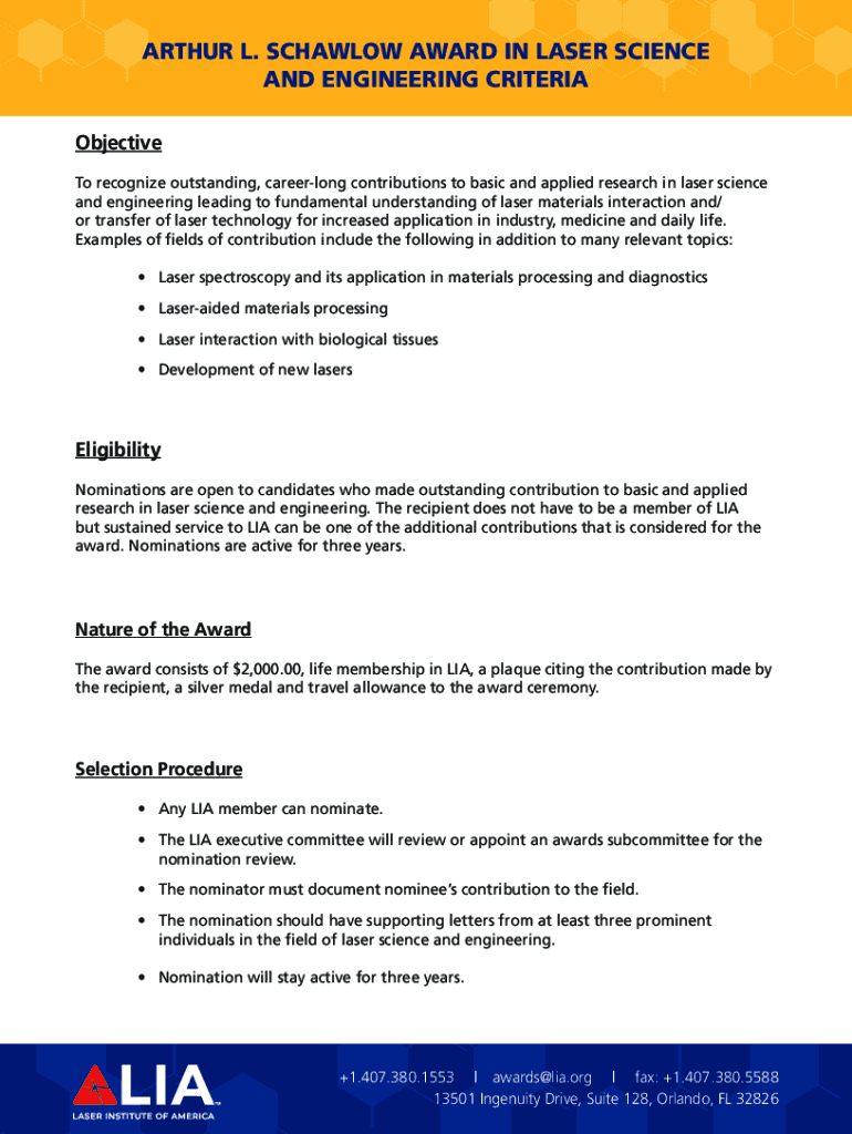 ARTHUR L. SHALLOW AWARD IN LASER SCIENCE AND ENGINEERING CRITERIA Objective To recognize outstanding, career long contributions to basic and applied research in laser science and engineering leading