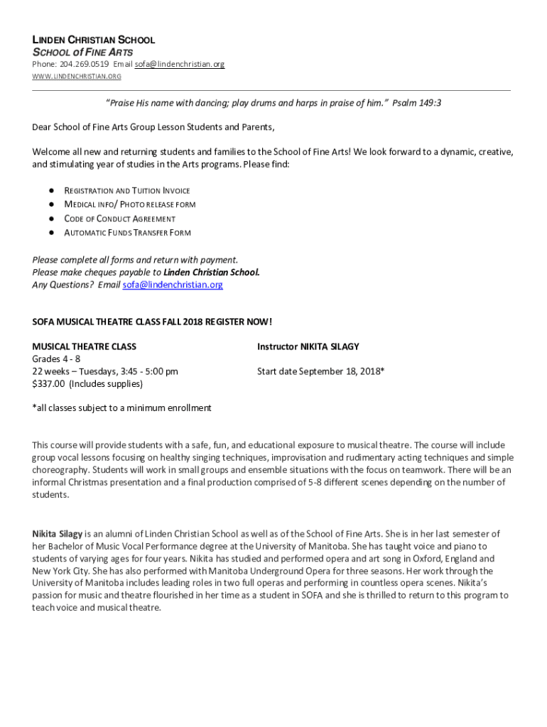 LINDEN CHRISTIAN SCHOOL of FINE ARTS Phone: 204.269.0519 Email sofa linden Christian.org WWW.LINDENCHRISTIAN.ORG Praise His name with dancing; play drums and harps in praise of him. Psalm 149:3 Dear