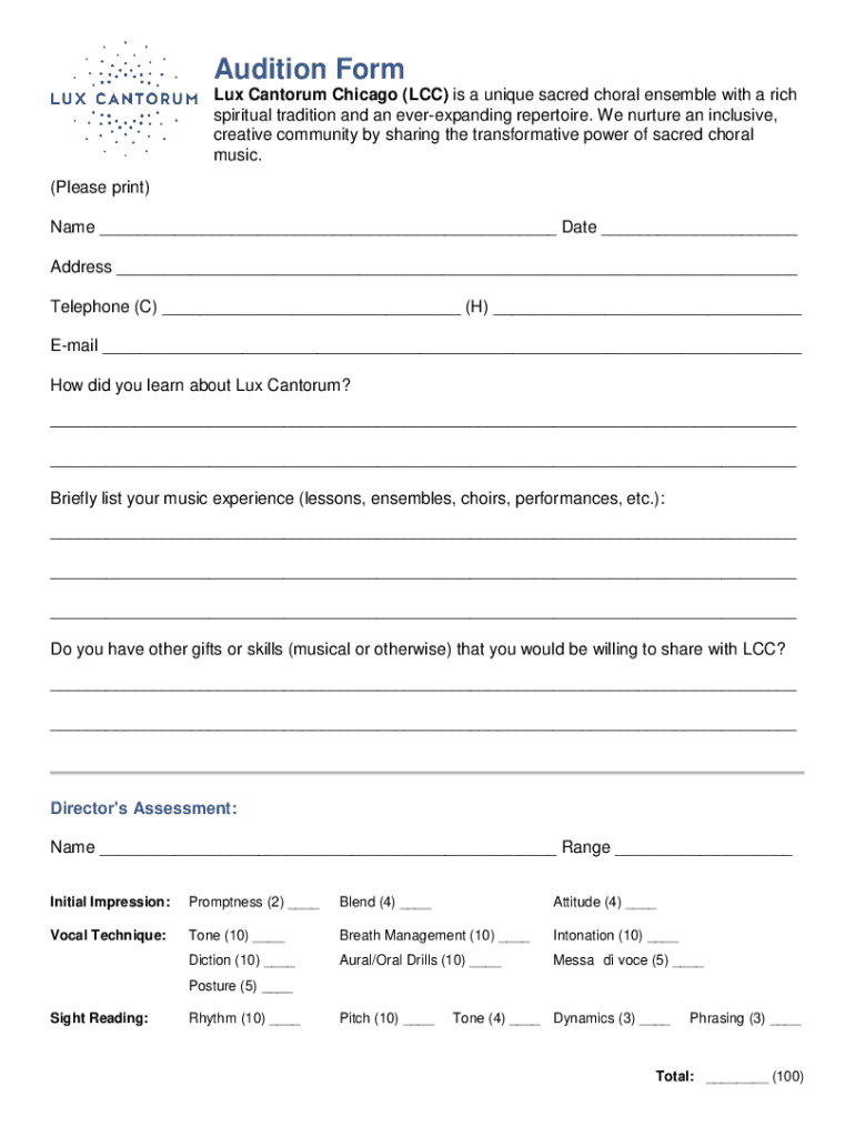 Audition Form Lux Canto rum Chicago (LCC) is a unique sacred choral ensemble with a rich spiritual tradition and an ever expanding repertoire. We nurture an inclusive, creative community by sharing