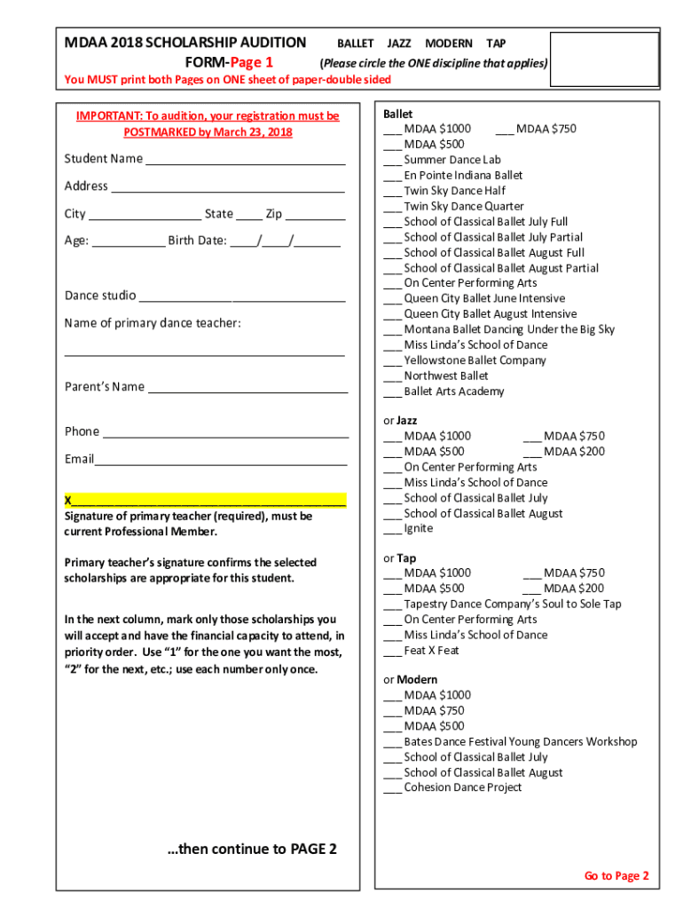 DAA 2018 SCHOLARSHIP AUDITION FORM Page 1BALLETJAZZMODERNTAP(Please circle the ONE discipline that applies) You MUST print both Pages on ONE sheet of paper double-sided IMPORTANT: To audition, your