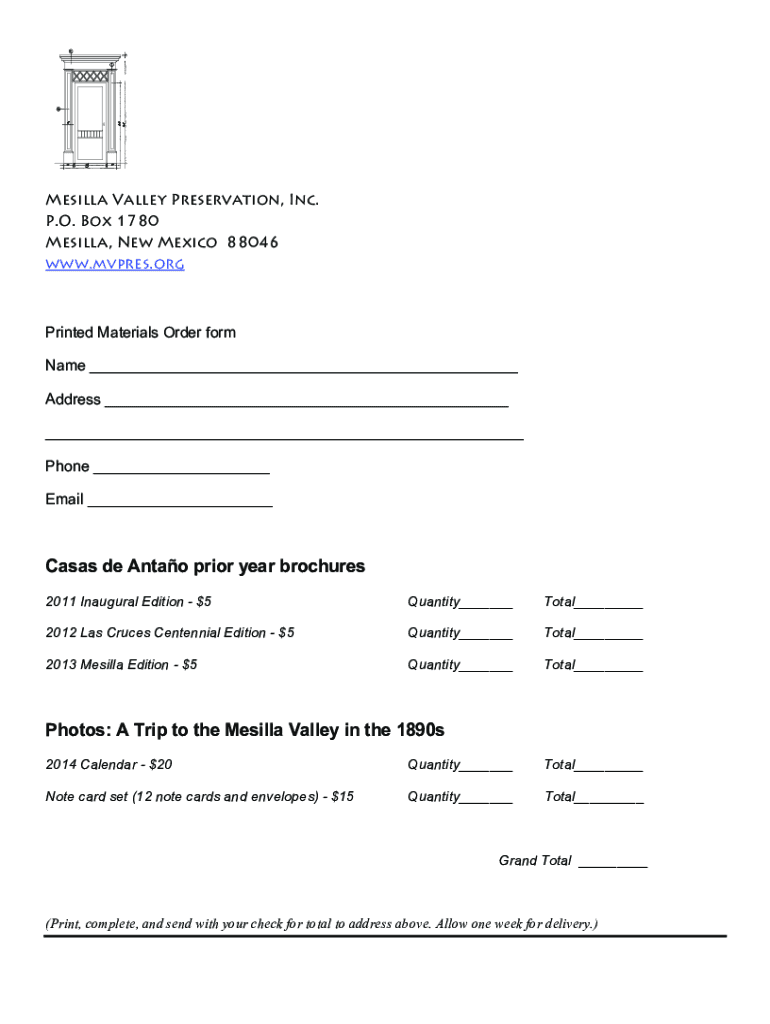 Mozilla Valley Preservation, Inc. P.O. Box 1780 Mozilla, New Mexico 88046 www.mvpres.orgPrinted Materials Order form Name Address Phone Email Cases de Antao prior year brochures 2011 Inaugural Edition