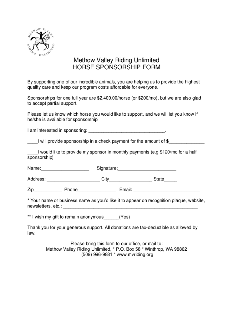 Get the free PDF Methow Valley Riding Unlimited HORSE SPONSORSHIP FORM
