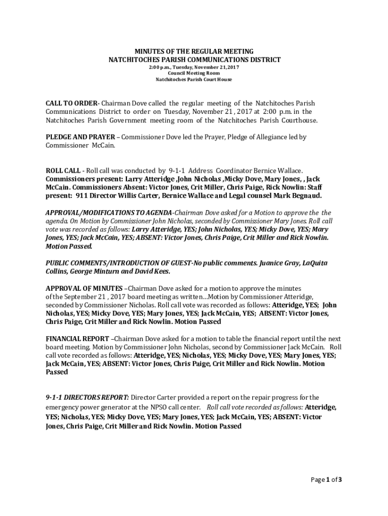 MINUTES OF THE REGULAR MEETING NATCHITOCHES PARISH COMMUNICATIONS DISTRICT 2:00 p.m., Tuesday, November 21, 2017, Council Meeting Room Natchitoches Parish Court Household TO ORDER Chairman Dove called