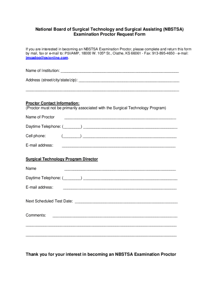 National Board of Surgical Technology and Surgical Assisting (NBS TSA) Examination Proctor Request Form If you are interested in becoming an NBS TSA Examination Proctor, please complete and return