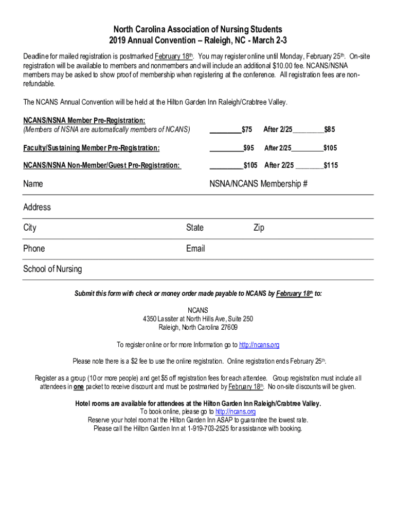 North Carolina Association of Nursing Students 2019 Annual Convention Raleigh, NC March 23 Deadline for mailed registration is postmarked February 18th. You may register online until Monday, February