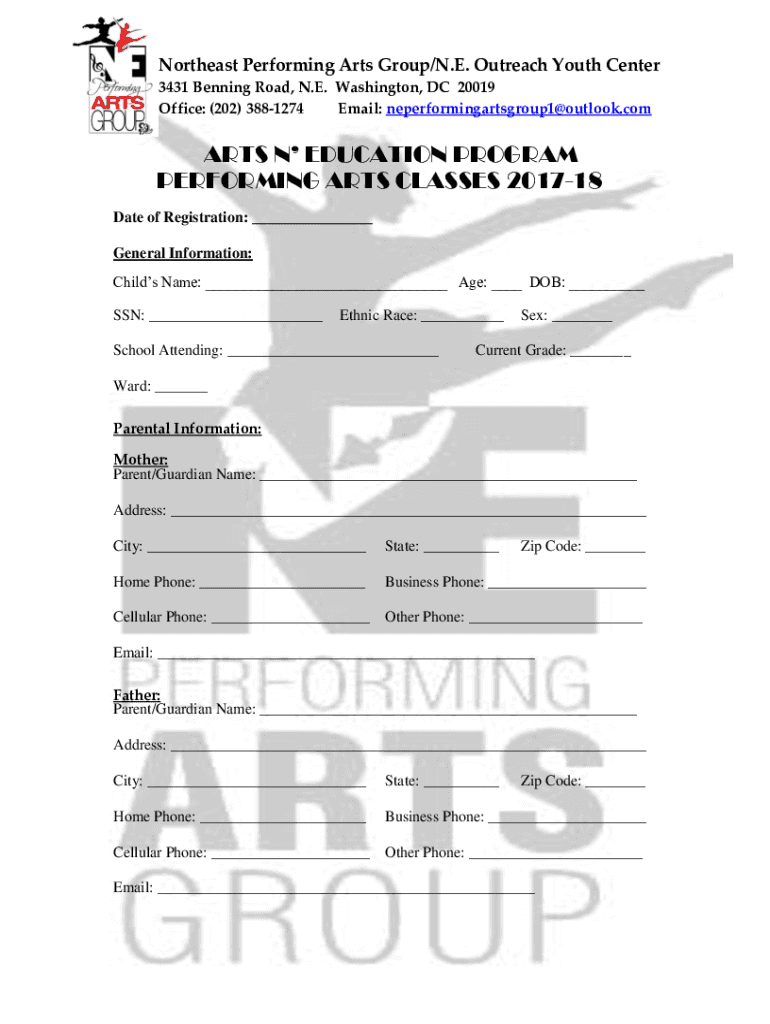 Northeast Performing Arts Group/N.E. Outreach Youth Center 3431 Benning Road, N.E. Washington, DC 20019 Office: (202) 3881274 Email: neperformingartsgroup1 outlook.com ARTS N EDUCATION PROGRAM PERFORMING
