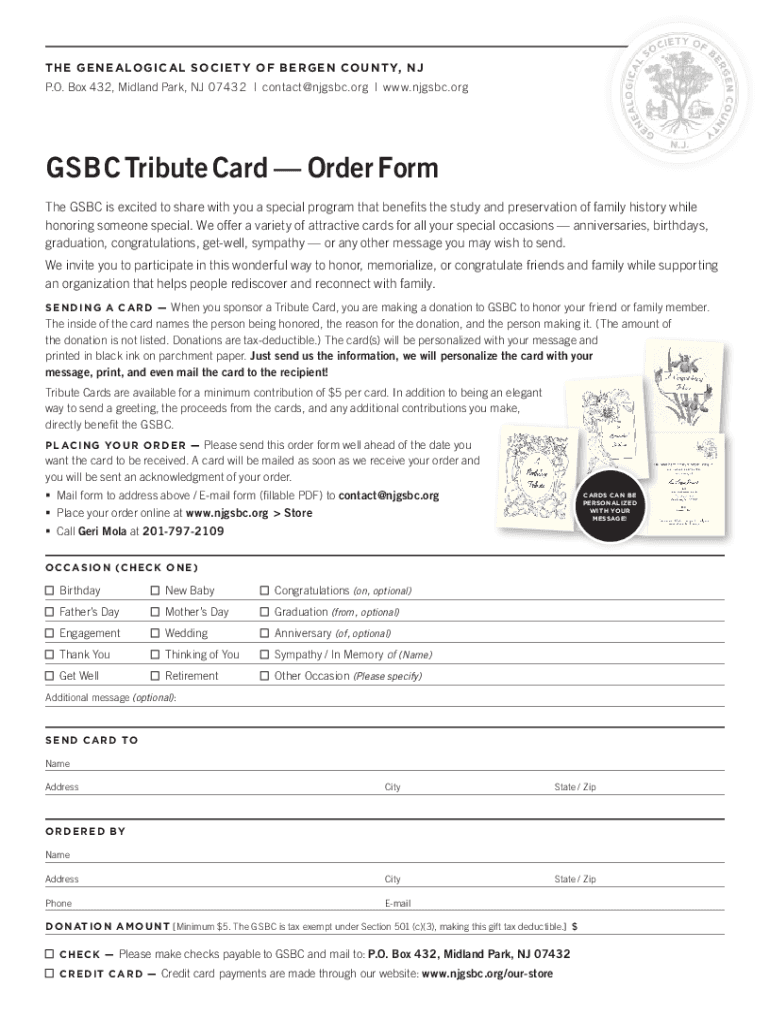 TH E G E N E A LO G I C A L SO CI E T Y O F B E R G E N CO U NT Y, N JP. O. Box 432, Midland Park, NJ 0 74 3 2 contact HSBC.org www.njgsbc.orgGSBC Tribute Card Order Form The HSBC is excited to share