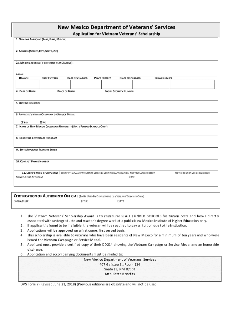 New Mexico Department of Veterans Services Application for Vietnam Veterans Scholarship 1. NAME OF APPLICANT (LAST, FIRST, MIDDLE)2. ADDRESS (STREET, CITY, STATE, ZIP)2A. MAILING ADDRESS (IF DIFFERENT