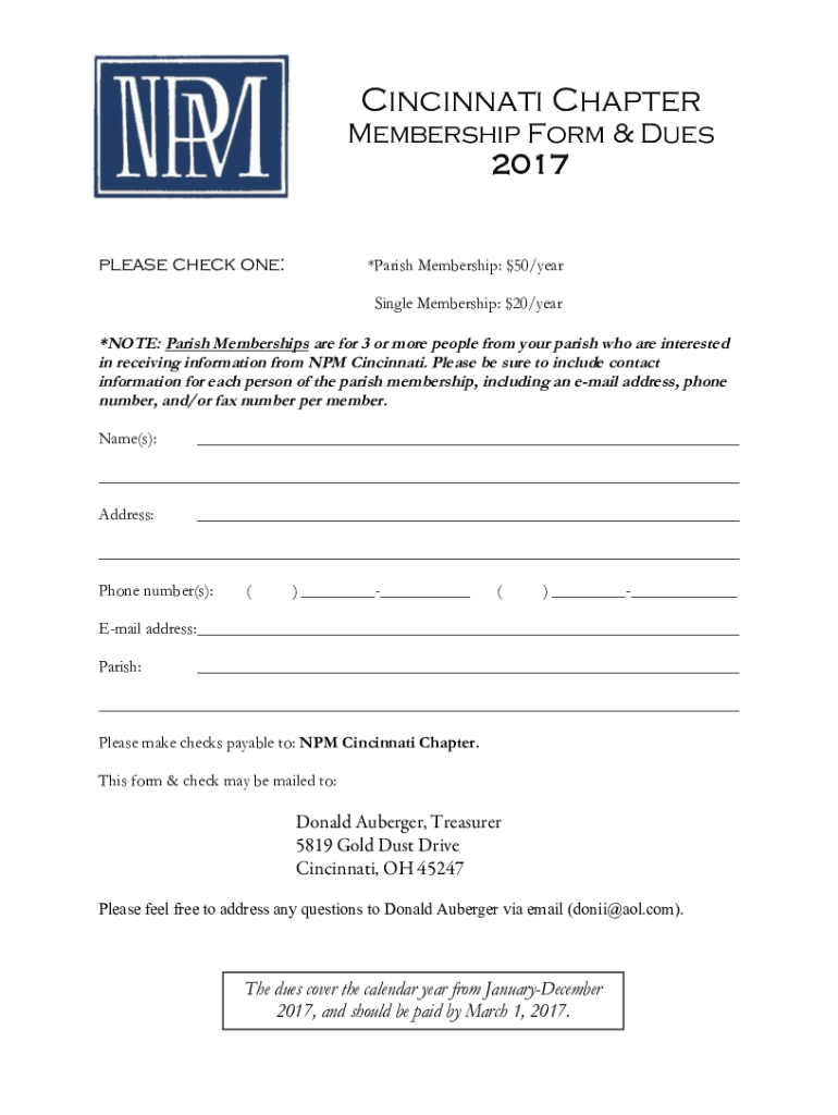 Cincinnati Chapter Membership Form & Dues 2017please check one:*Parish Membership: $50/year Single Membership: $20/year×NOTE: Parish Memberships are for 3 or more people from your parish who are