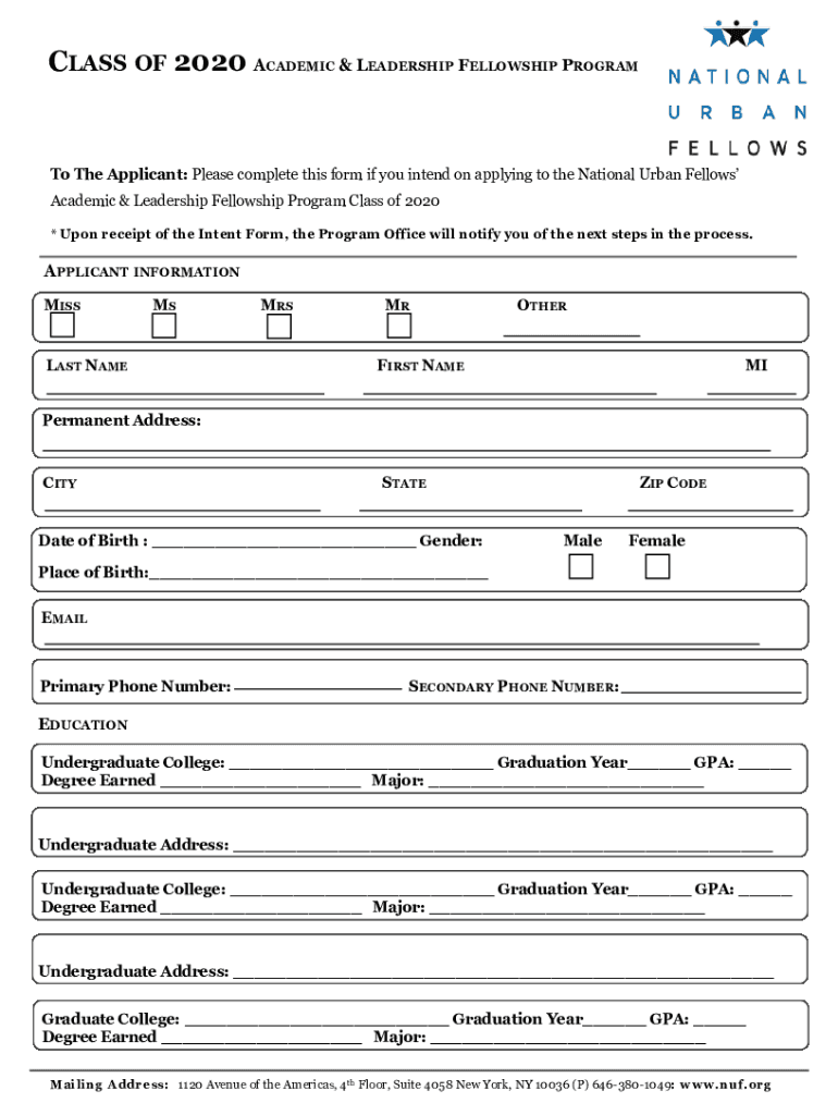CLASS OF 2020 ACADEMIC & LEADERSHIP FELLOWSHIP Program The Applicant: Please complete this form if you intend on applying to the National Urban Fellows Academic & Leadership Fellowship Program Class