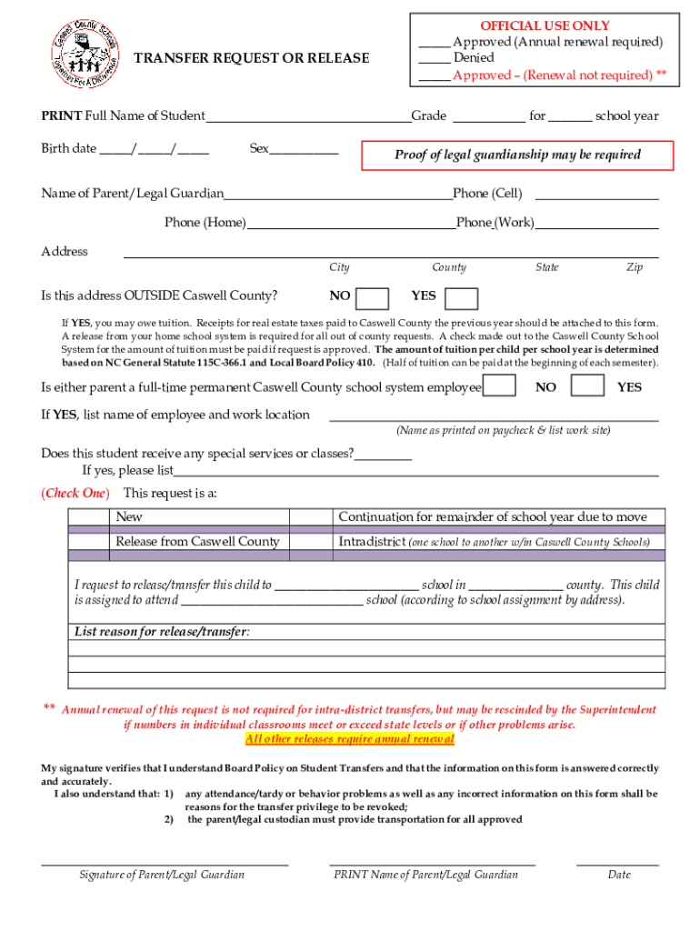 TRANSFER REQUEST OR RELEASEPRINT Full Name of Student Birth date / / OFFICIAL USE ONLY Approved (Annual renewal required) Denied Approved (Renewal not required) ** Grades ex for school wearproof of