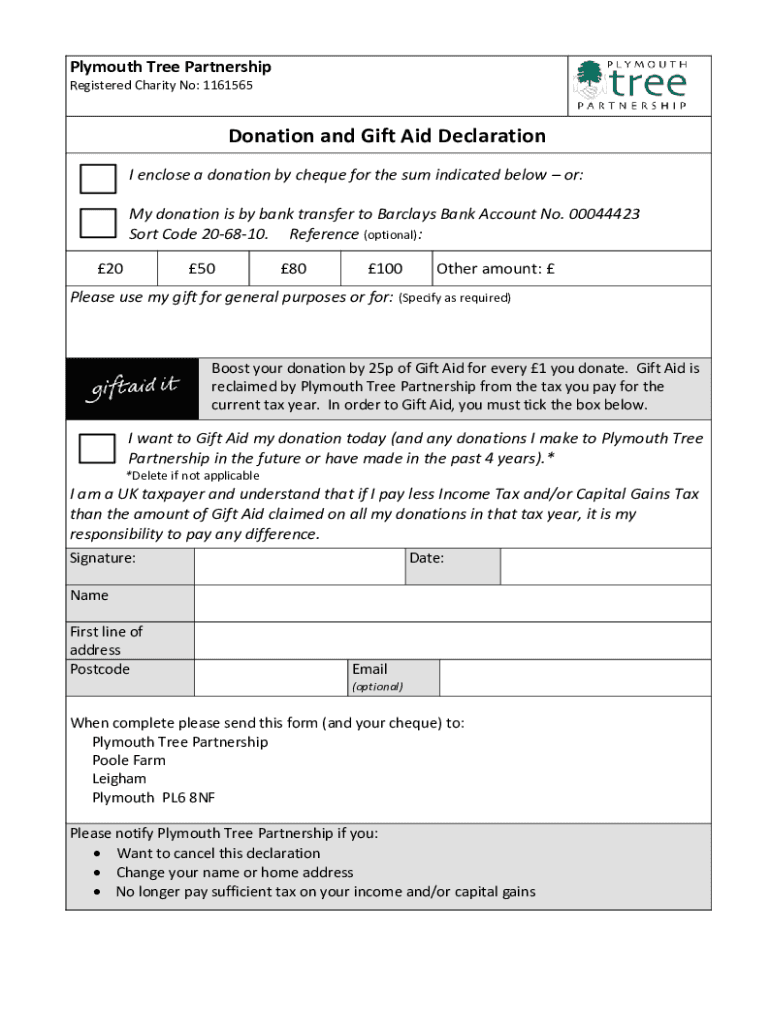 Plymouth Tree Partnership Registered Charity No: 1161565Donation and Gift Aid Declaration I enclose a donation by check for the sum indicated below or: My donation is by bank transfer to Barclays