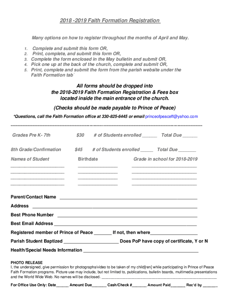 2018 2019 Faith Formation Registration Many options on how to register throughout the months of April and May. 1. 2. 3. 4. 5. Complete and submit this form OR, Print, complete, and submit this form