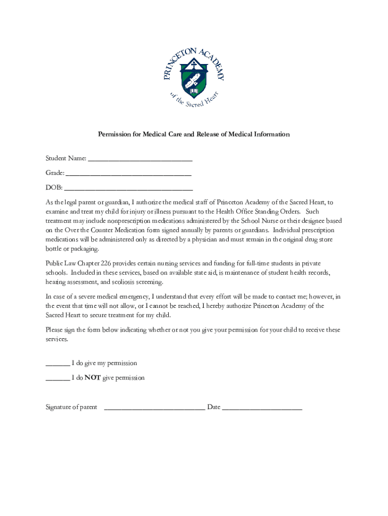 Permission for Medical Care and Release of Medical Information Student Name: Grade: DOB: As the legal parent or guardian, I authorize the medical staff of Princeton Academy of the Sacred Heart, to