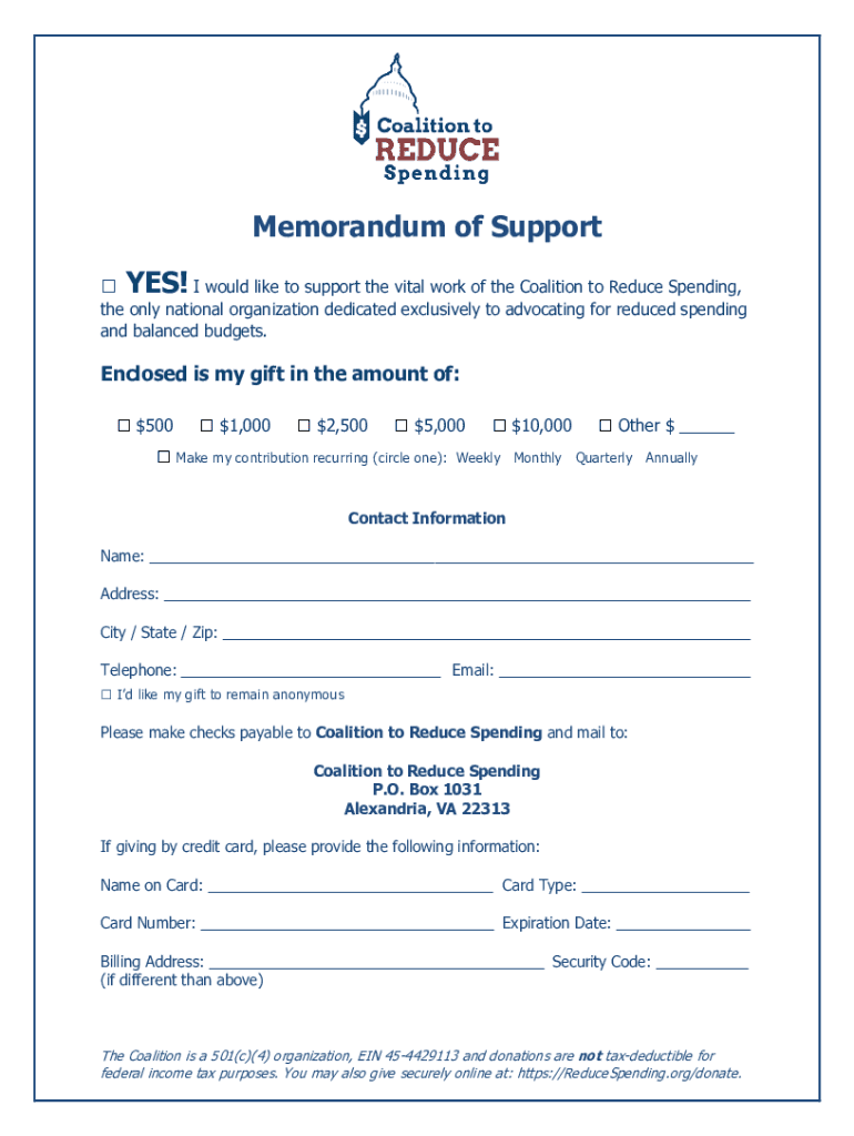 Memorandum of Support YES! I would like to support the vital work of the Coalition to Reduce Spending, the only national organization dedicated exclusively to advocating for reduced spending and balanced