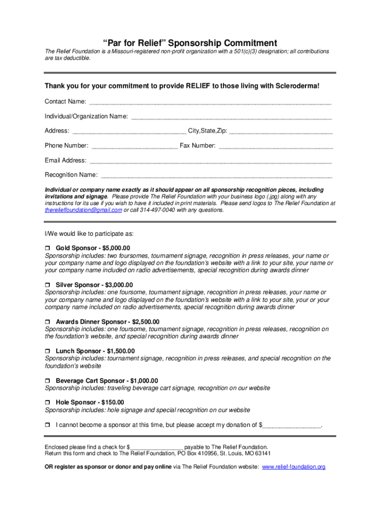 Par for Relief Sponsorship Commitment The Relief Foundation is a Missouri registered nonprofit organization with a 501(c)(3) designation; all contributions are tax-deductible. Thank you for your commitment
