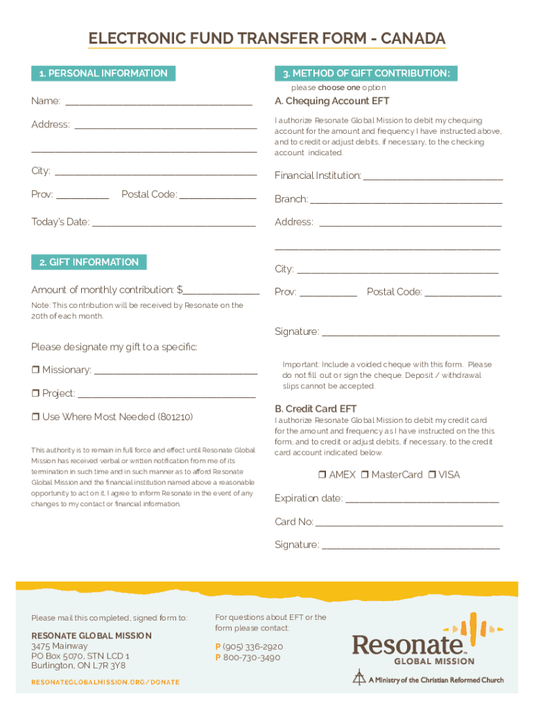 ELECTRONIC FUND TRANSFER FORM CANADA 1. PERSONAL INFORMATION3. METHOD OF GIFT CONTRIBUTION: please choose one optional: A. Cheating Account Address: I authorize Resonate Global Mission to debit my
