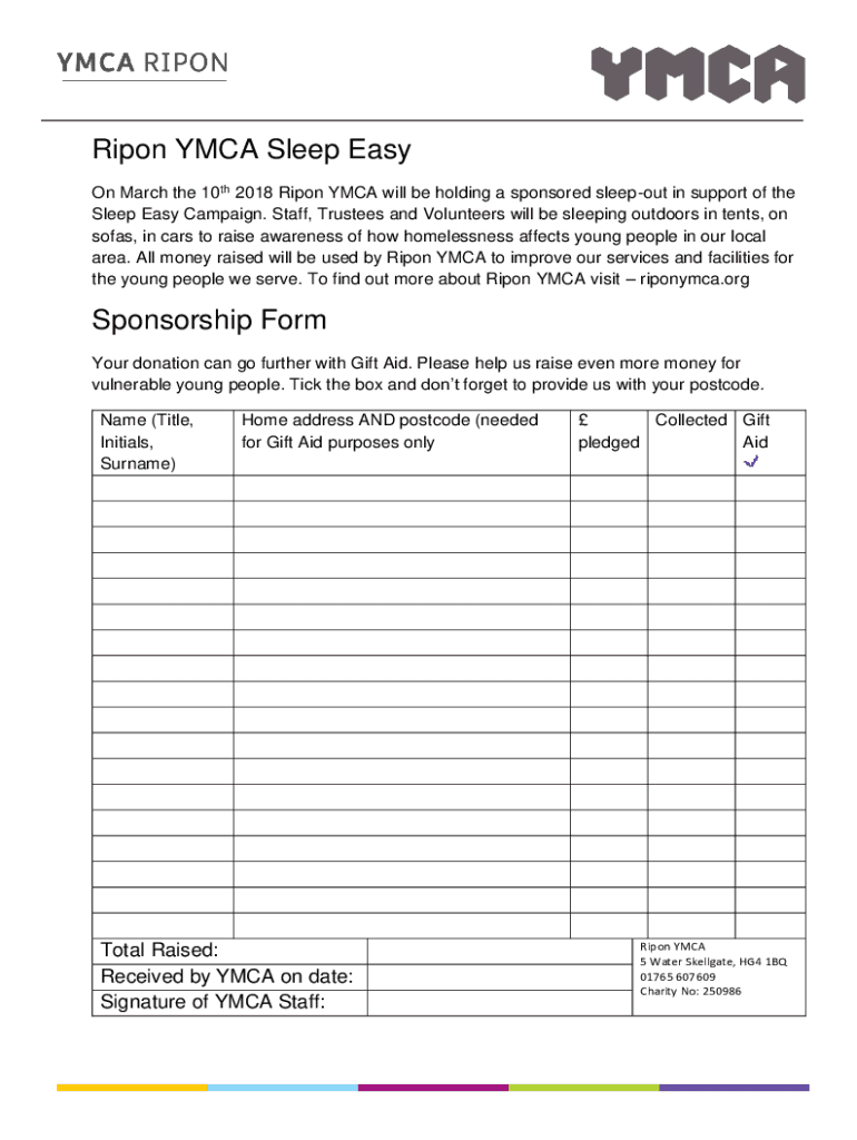 Ripen YMCA Sleep Easy On March the 10th 2018 Ripen YMCA will be holding a sponsored sleep out in support of the Sleep Easy Campaign. Staff, Trustees and Volunteers will be sleeping outdoors in tents,